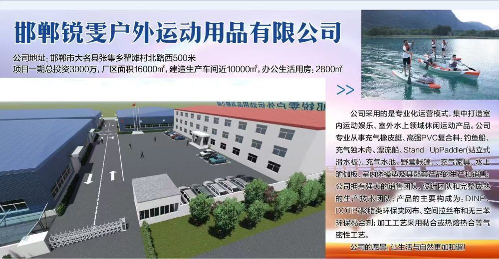 Handan RideWave Outdoor Products Co., Ltd. is located 500 meters west of Zhaitan Village North Road, Zhangtieji Township, Daming County. The company was established on March 18, 2021, with a registered capital of 5 million RMB. It adopts a professional operation model and focuses on creating indoor sports and entertainment, as well as outdoor water sports leisure products. The company specializes in the production and sales of rescue rubber boats, high-strength PVC composite materials, inflatable canoes for fishing boats, drifting boats, Stand UoPaddler (standing water skis), inflatable pools, camping tents, inflatable furniture, water yoga boards, indoor gymnastics mats and their supporting products. The company has a strong sales team, design team and a complete and mature production technology team. The main components of the products are DINPDOTP/polyester environmentally friendly mesh cloth, space brushed cloth and non triphenyl environmentally friendly adhesive; The processing technology adopts airtight processes such as bonding or hot melt heat sealing.